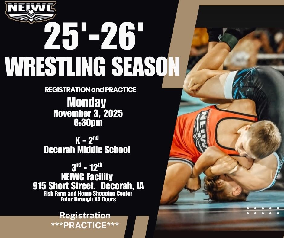 Calling all K–12 students—boys and girls—ready to hit the mats! The Northeast Iowa Wrestling Club welcomes athletes of all experience levels to join our upcoming season starting Monday, November 3. Practices will be held on Mondays and Thursdays, with sessions for grades K–2 at Decorah Middle School Wrestling Room (6:30–7:30 PM) and grades 3–12 at the NEIWC Facility, 915 Short Street (6:30–8:00 PM).
