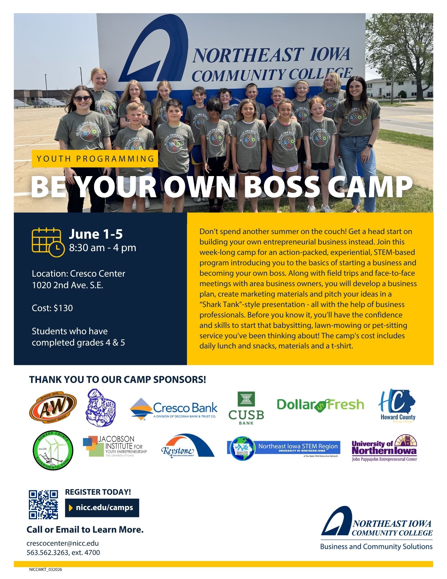 Helpful Info: If you'd like an application for this camp, please contact Hallie Gragert at gragerth@nicc.edu – Applications are due by May 1. Notice of acceptance will be by May 15.